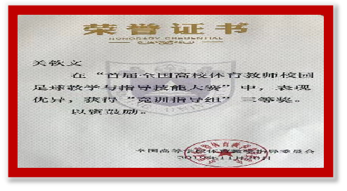本次大赛是为了深入学习习近平总书记在全国教育大会上讲话精神,落实《国务院办公厅关于强化学校体育促进学生身心健康全面发展的意见》(国办发﹝2016﹞27号)和《教育部等6部门关于加快发展青少年校园足球的实施意见》(教体艺﹝2015﹞6号)文件精神,发挥教指委学校引领示范作用,不断促进学校体育改革中“教会、勤练、常赛”机制的落实而举行的一次全国高校体育教师校园足球教学与指导技能大赛。比赛分为竞训组和教学组,测试内容均为网络评审和现场测试两个环节,其中网络评审项目为教学设计与教学实践,要求网络上传20分钟无删减的教学视频;现场测试为5x20米折返跑、90秒跳绳、28米传准、绕杆运射、1分钟颠球等体能与专项技能项目。比赛异常激烈,精彩纷呈。德赢德赢winac米兰关钦文老师作为高水平足球队助理教练参加了竞训组的比赛,并获得三等奖。