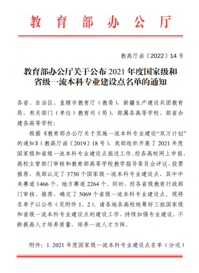 2022年6月8日,教育部印发了《教育部办公厅关于公布2021年度国家级和省级一流本科专业建设点名单的通知》(教高厅函[2022]14号),我院体育教育专业成功入选国家级一流本科专业建设点。至此,我院体育教育专业实现了从重庆市级一流专业建设点向国家级一流专业建设点的跨越。