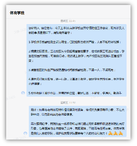 学院党总支书记王静第一时间在学院师生群传达学校信息,从早晨6点到第二天凌晨1点通过网络和电话解答师生各种问题,她呼吁全院师生关键时刻要提高政治站位,增强责任意识和危机意识,时刻保持高度警惕,随时关注学校信息,不信谣不传谣,按照学校要求每天坚持做核酸,不外出不聚集,充分发扬体育精神,用实际行动证明学院师生守得住规矩、扛得住压力、经得起考验,展示德赢winac米兰团结和谐、积极进取的精神风貌。