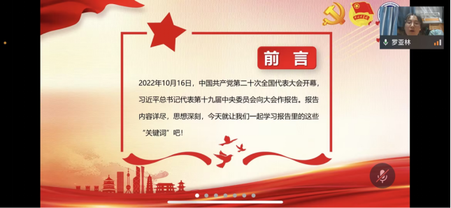 本次会议由尹潇同学主持,首先由罗亚林同学带领大家从14组关键词了解党的二十大报告,让大家对党的二十大报告有了更加深入的了解与认识。张译同学为大家解读《关于巩固高校学生会(研究生会)改革成果的若干措施》,一是要深刻理解党对高校学生会组织的殷切希望,坚持“从同学中来,到同学中去”。二是需要准确把握高校学生会组织改革的历史脉络,不负人民,青春向党,提升自身的服务能力。三是学习新一轮高校学生会组织改革的主要思路,突出政治方向,体现分层分类,立足实践操作。并提醒抓实高校学生会组织改革的主要举措,当好党联系青年学生的桥梁和纽带。