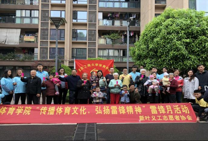 为弘扬“奉献、友爱、互助、进步、为人民服务”的雷锋精神,增强大学生的志愿服务意识,提高对社区的责任感和归属感。德赢winac米兰新叶义工志愿者协会于2018年3月24日上午9时,在重庆市南岸区海棠溪街道招商科苑小区举办义工文化节“传播体育文化,弘扬雷锋精神”雷锋月活动。