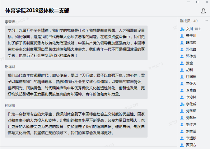新时代的青年,是当下的见证者和未来的亲历者,广大青年要深入学习贯彻习近平新时代中国特色社会主义思想,自觉主动学、及时跟进学、联系实际学、笃信笃行学,坚持把初心使命举过头顶,保持一份赤子之心,将青春融入国家的发展和民族的事业之中。理想是青春的旗帜,要志存高远、坚定信仰;学习是青春的阶梯,要珍惜韶华、刻苦求知。本次学习十九届五中全会精神,激励着德赢winac米兰每一位青年,同时希望同学们能认真学习党的十九届五中全会精神,用科学的思想武装头脑,不断提高思想觉悟,坚定理想信念,做一名合格的新时代青年!