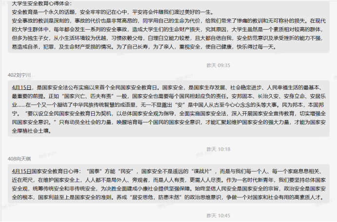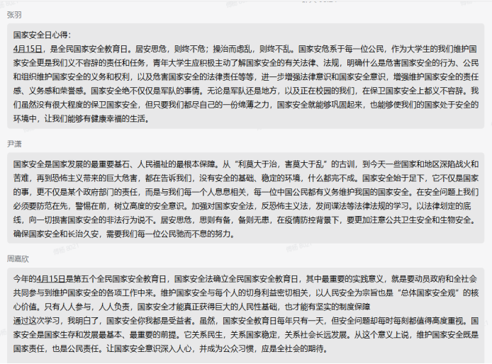 20级1班孙志烨谈到:4月15号是全民国家安全教育日,不可否认,我们当下生活于和平年代,但安全总是相对的,需要每个人为之努力奋斗,才能搏得更加长久的安全稳定。经过国家安全教育的学习,深知国家安全的重要性。国家安全教育是立德树人的必然要求,我们要树立国家利益至上的观念,长存忧患意识。我们在行使自身权利的同时,不能损害国家和集体利益。在维护国家安全,人人不是局外人、旁观者,而是你我有责,更需人人尽责方能山河无恙,你我相安。