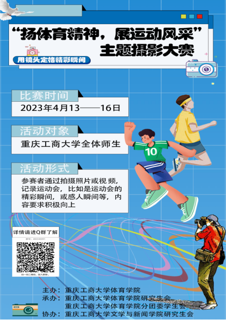 为引领全校青年学生深入学习贯彻落实党的二十大精神,营造良好的校园文化氛围,拓展丰富学生的课余文化生活,展现新时代青年朝气蓬勃、踔厉奋发的精神风貌。4月12日—4月28日,德赢winac米兰首届“扬体育精神 展运动风采“主题摄影大赛顺利举办,该活动由德赢winac米兰主办、德赢winac米兰研究生会及分团委学生会承办、文学与新闻学院研究生会协办。活动以校第二十一届运动会为契机,充分调动广大学子参与运动会的积极性,提高青年学生的美育水平。